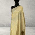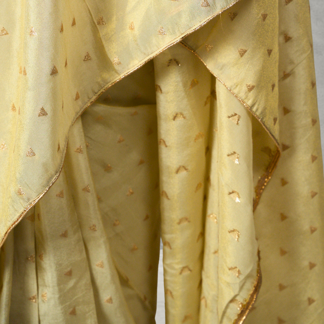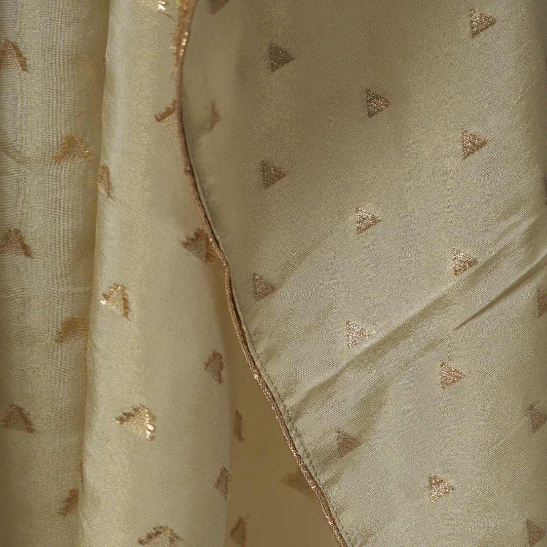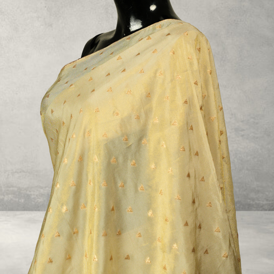 Elevate your festive wardrobe with this exquisite Golden Saree from the House of Sogene, crafted to make a statement of elegance and tradition. This saree features a luxurious golden base that exudes opulence, adorned with meticulously woven triangle buttas throughout the fabric. The geometric triangle motifs introduce a contemporary flair to the classic design, making this saree a perfect blend of modern style and traditional charm.