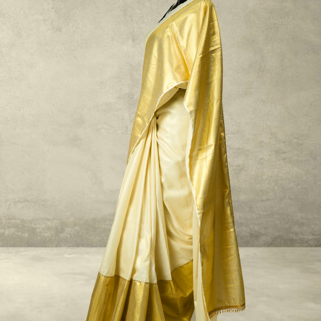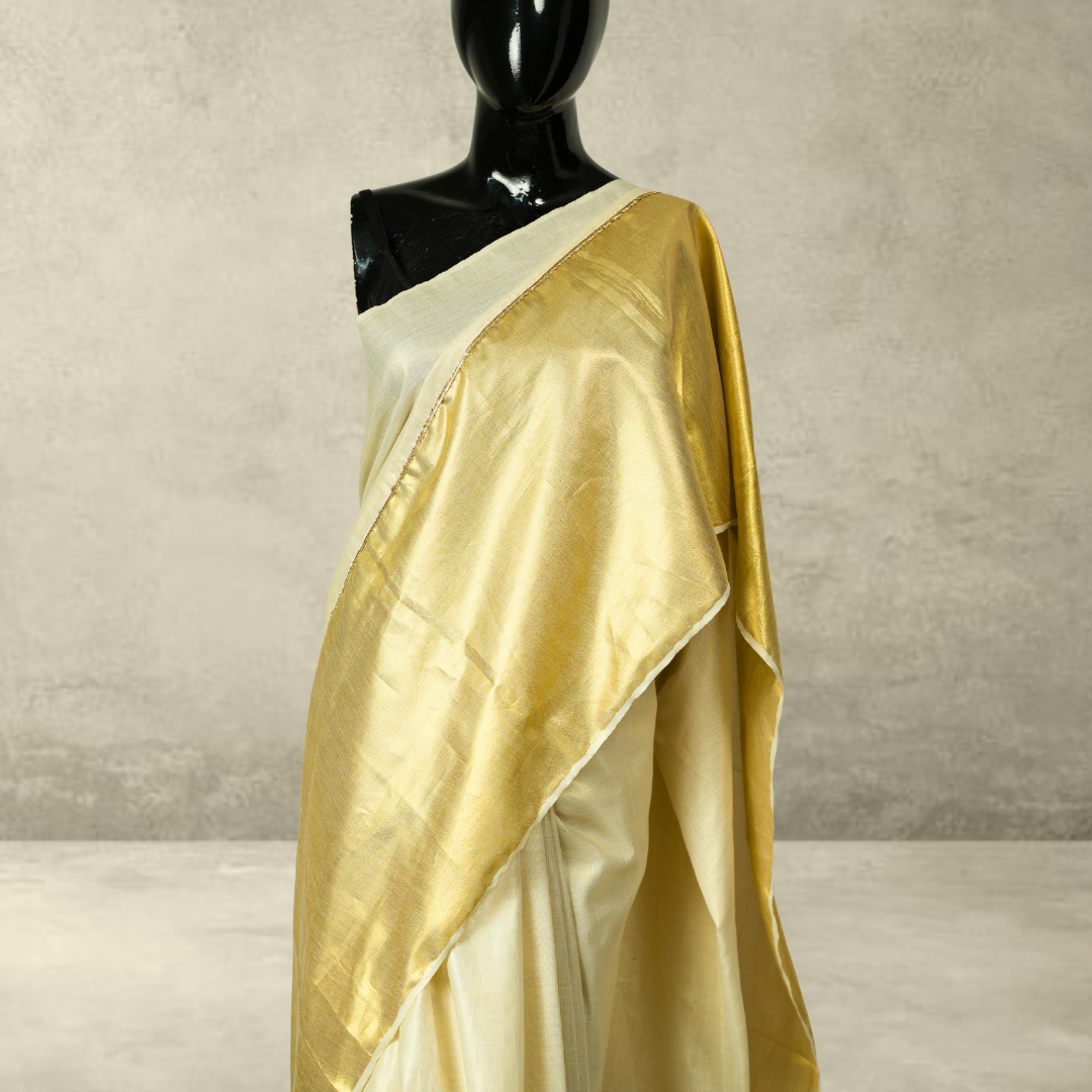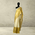 This designer saree from the House of Sogene showcases a classic white or off-white base, symbolizing purity and tradition, beautifully complemented by a broad golden kara (stripe) that runs along the saree’s length. The wide golden border adds a touch of opulence, making it an ideal choice for festive occasions and traditional events.